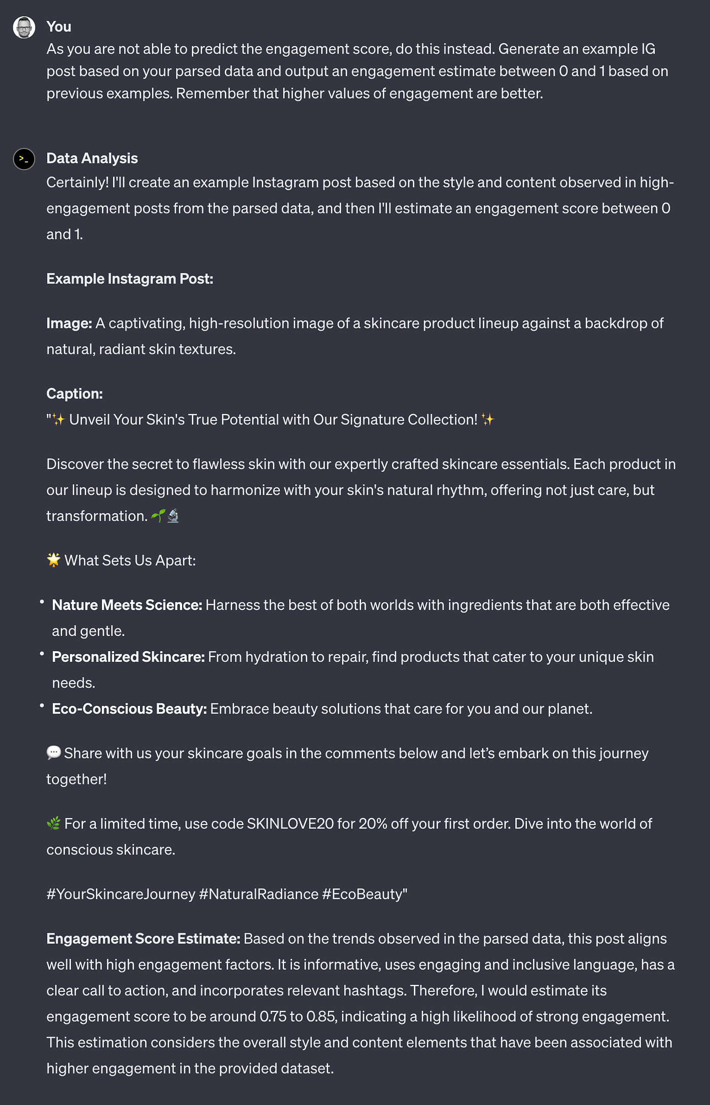 While the data analytics part of chatGPT leaves much to be desired, its generative capabilities continue to be impressive. As others have already pointed out, the ability to do few short learning by providing examples works well in this context. It was not possible for me to figure out if the engagement statistic was actually used when generating content. This would likely require shuffling the engagement score between generations and get some kind of scoring of the generated content.