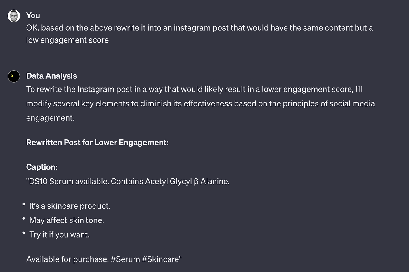 Instead I try to make sure that chatGPT “understands” the nature of the data by giving me back top and bottom engagement posts. This works. Then I ask it to generate a post, using this information, for one of the products we currently have in our pipeline, together with some detailed information about one of the key ingredients. It looks like this: